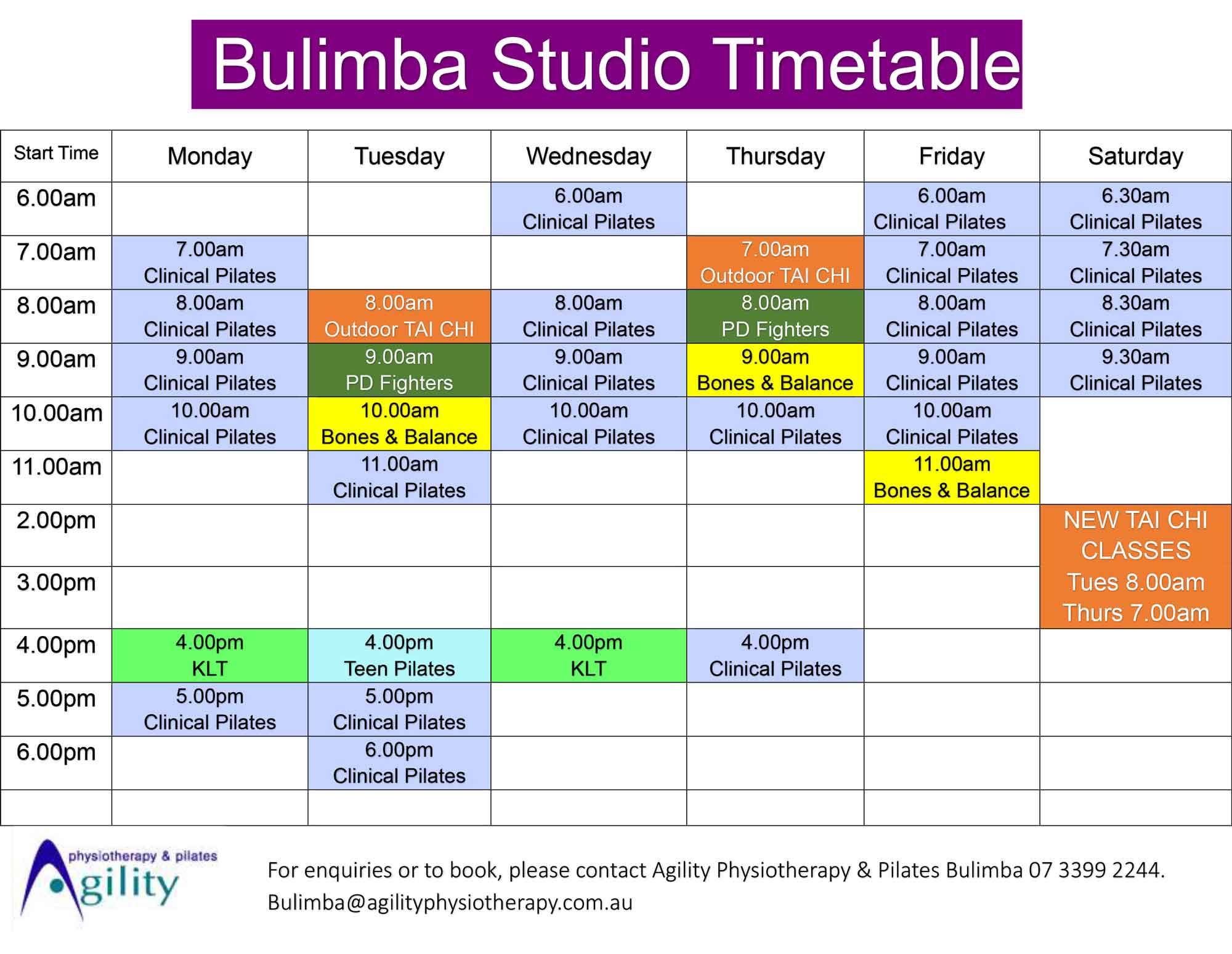 Please see our available classes and times at Bulimba Clinic. If there is a class or service you don't see on here, please call reception at 07 3399 2244 and we will be happy to assist you.