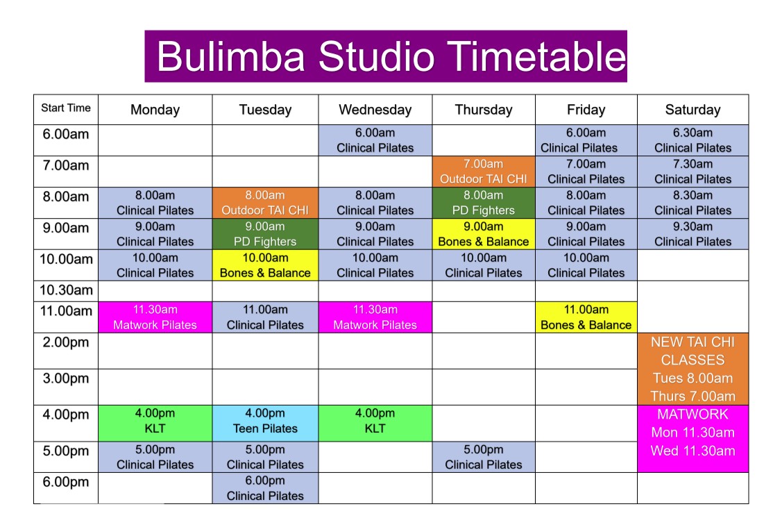 Please see our available classes and times at Bulimba Clinic. If there is a class or service you don't see on here, please call reception at 07 3399 2244 and we will be happy to assist you.